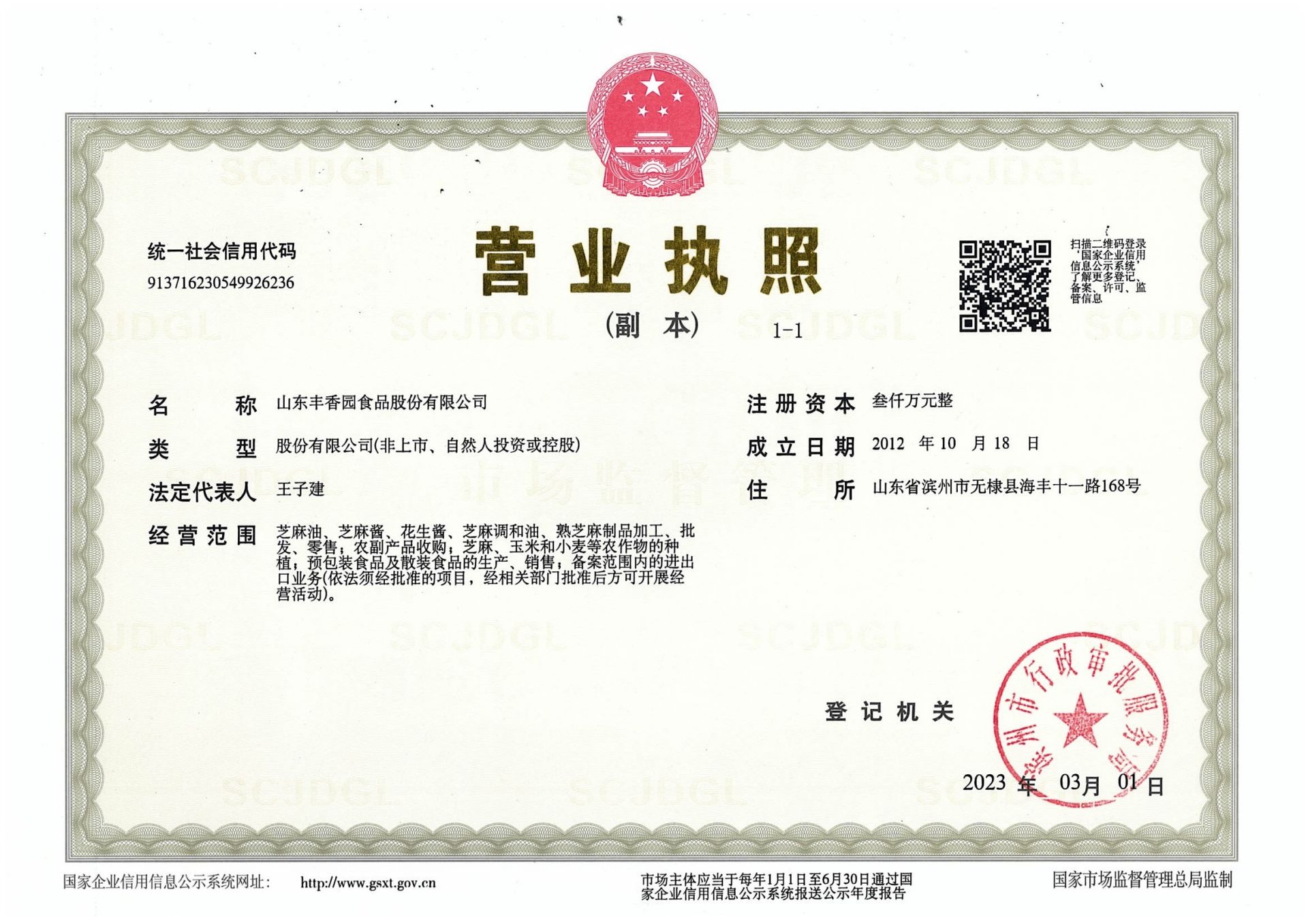 山東豐香園食品股份有限公司位于無棣縣西城工業(yè)園,成立于2012年,注冊資本3000萬元,員工60多人,年銷售收入8000多萬元,是“國家高新技術企業(yè)”、“中國好糧油”示范企業(yè)、“食安山東”示范生產(chǎn)加工企業(yè),公司集綠色、有機芝麻食品標準化、生產(chǎn)加工、研發(fā)、出口銷售為一體的山東省農(nóng)業(yè)產(chǎn)業(yè)化“重點龍頭企業(yè)”。 公司獲得HACCP國際質(zhì)量體系認證、ISO9001:2015質(zhì)量管理體系認證,產(chǎn)品獲得美國FDA認證、美國、歐盟有機食品認證、英國BRC體系認證、A級綠色食品認證、GB國標有機食品認證。 公司主要產(chǎn)品有芝麻油、芝麻醬、花生醬、芝麻粉和烘焙芝麻、兒童芝麻食品系列等六大種類上百個品種,產(chǎn)品出口美國、日本、韓國、新加坡、俄羅斯、澳大利亞、美國、等30多個國家。2018-2019年連續(xù)兩年芝麻食品出口量排名山東省第三位、濱州市第一位。 山東豐香園食品股份有限公司是國家級高新技術企業(yè),建有省級“一企一技術”研發(fā)中心、市級企業(yè)技術中心和市級工程實驗室、市級工程技術中心等多個創(chuàng)新平臺,擁有發(fā)明專利2項,實用新型專利21項,先后獲得省級“專精特新”中小企業(yè)、市級農(nóng)業(yè)產(chǎn)業(yè)化聯(lián)合體、科技型中小企業(yè)、濱州市級瞪羚企業(yè)、市級“一企一技術”創(chuàng)新企業(yè)和濱州市新興產(chǎn)業(yè)“白名單”企業(yè)等榮譽稱號。